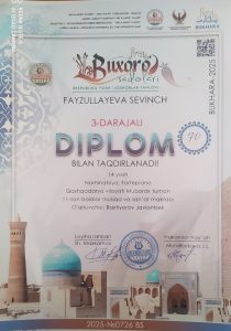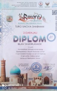Qashqadaryo viloyati madaniyat boshqarmasi tasarrufidagi Muborak tuman 11-son bolalar musiqa va sanʼat maktabi fortepiano bo‘limi 6-sinf o‘quvchisi Fayzullayeva Sevinch ishtirok etib faxrli 3-o‘rinni egalladi.