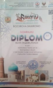 Qashqadaryo viloyati madaniyat boshqarmasi tasarrufidagi Muborak tuman 11-son bolalar musiqa va sanʼat maktabi Qarliq filiali tasviriy sanʼat bo‘limi 2-sinf o‘quvchisi Bozorova Shukrona ishtirok etib faxrli 3-o‘rinni egalladi.
