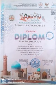 Qashqadaryo viloyati madaniyat boshqarmasi tasarrufidagi Muborak tuman 11-son bolalar musiqa va sanʼat maktabi anʼanaviy xonandalik yo‘nalishi 1-sinf o‘quvchisi Toshpo‘latova Mohinur «Buxoro sadolari» respublika yosh ijodkorlar ko‘rik tanlovida ishtirok etib faxrli 1-o‘rinni egalladi.